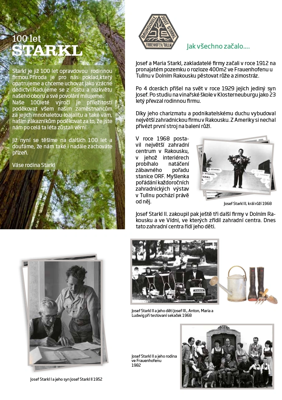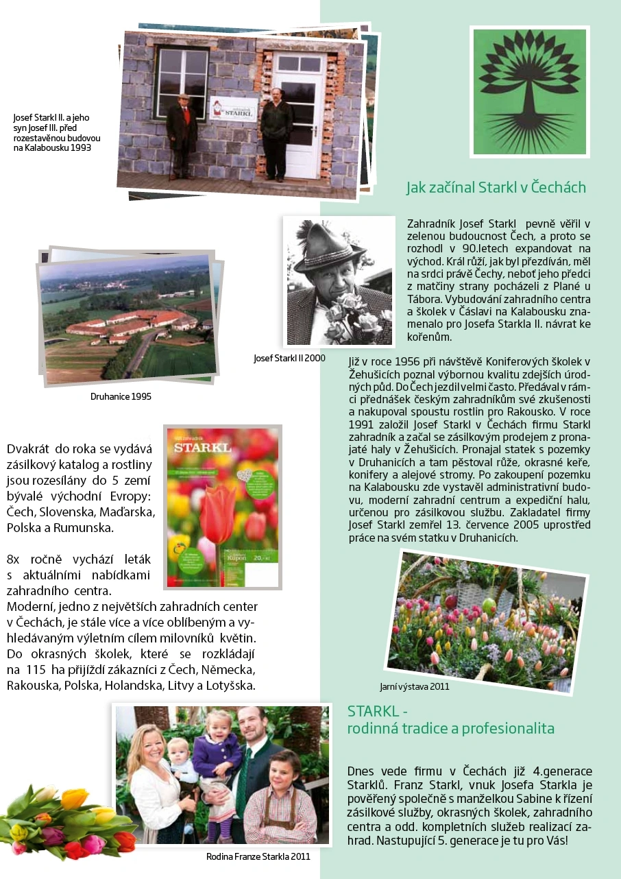 Již po 4. generace trvá existence rodinné firmy zahradníka STARKLa. Současně však díky vysokému počtu členů nejmladší generace rodiny STARKLů, přichází do všech oblastí působení firmy STARKL inovační nápady, svěží duch a kreativita, které hrají velmi důležitou roli. Při realizacích zahrad, zahradní a krajinářské architektuře, či ve floristice dáváme volný průběh naší fantazii a současně necháváme velký prostor tradičním hodnotám. Jako zahradníci jsme zapustili silné kořeny a spoléháme na budoucnost - protože to, co nyní sázíme, bude v mnoha případech možné prodávat teprve za 10 i více let. Jako rodina s babičkou, rodiči, 18 vnoučaty a pravnoučaty máme něco zvláštního, o čem víme a čeho si vážíme. |